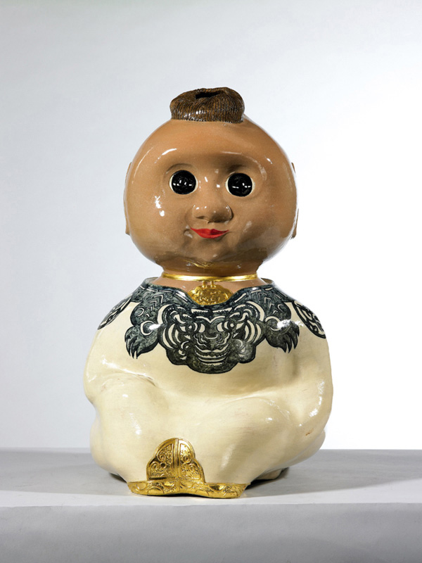 陶瓷的传统印象及形象在时代的蜕变中,思索着未来的发展与道路──《中国娃娃系列》代表着创作者明确感受到,时代性的敏锐嗅觉和切入的观点。反思,富裕生活中所产生令人吊诡的文明现象,以及东方文化中,禁固的性别差异,是现代中国社会现象的一环。本拍品《中国娃娃系列──长命富贵》运用象征"吉祥"的金饰与衣饰上的纹样图腾,强调现今社会父母,终其一生的辛劳,最简单的目的,是想将最好的一切赋予下一代。