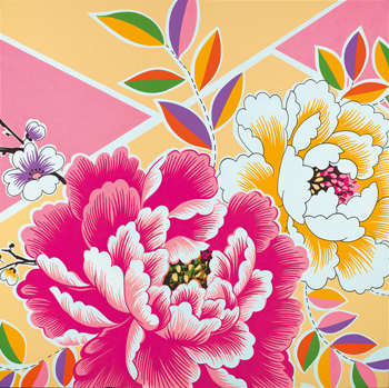 牡丹花所承载的正面意像流转至林明弘的画笔下,蜕变为台湾传统牡丹花布 (阿嬷的花布)为视觉主体的